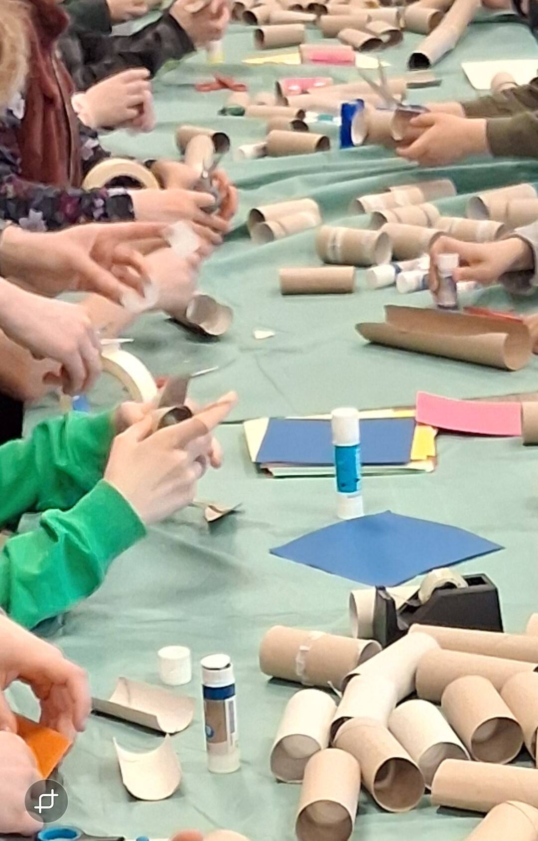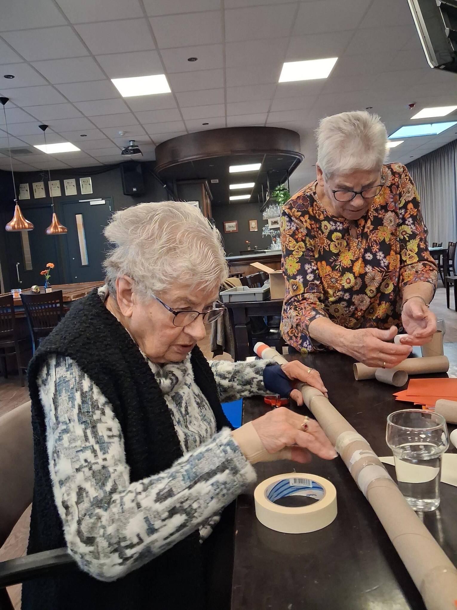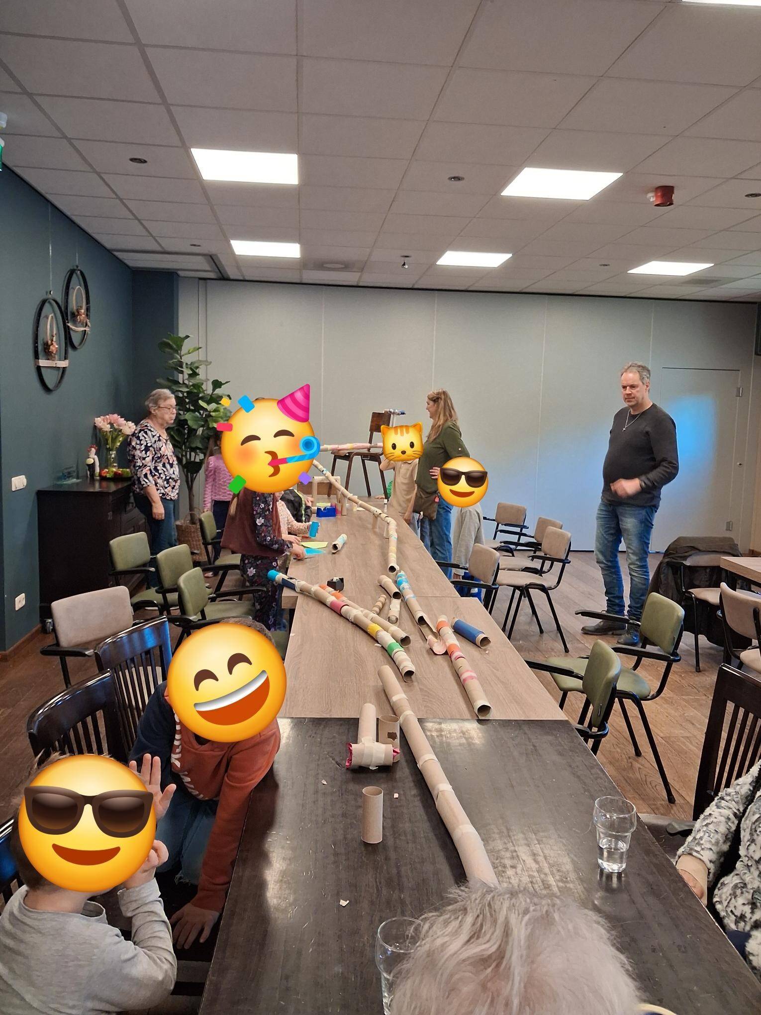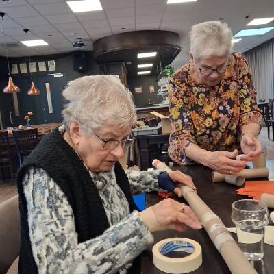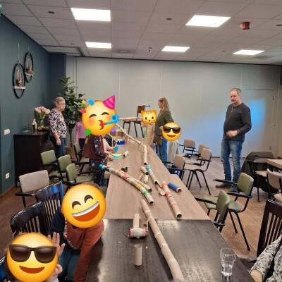 Samen een hele lange knikkerbaan bouwen van wc- en keukenrollen.